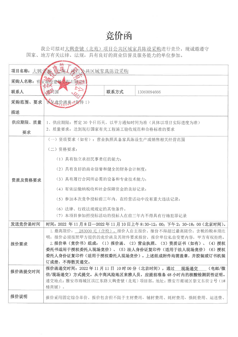 大興壹號(北苑)項(xiàng)目公共區(qū)域家具陳設(shè)采購競價函