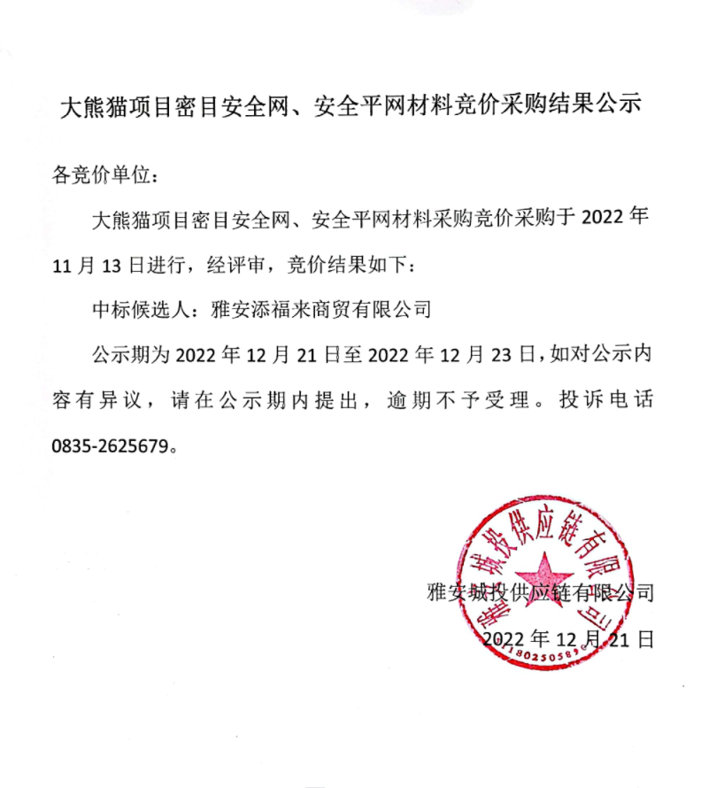 大熊貓項(xiàng)目密目安全網(wǎng)、安全平網(wǎng)材料競價(jià)采購結(jié)果公示