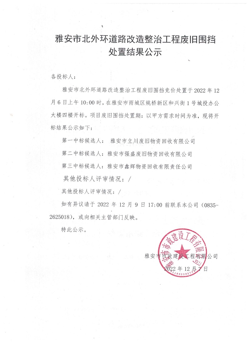 雅安市北外環(huán)道路改造整治工程廢舊圍擋處置結果公示