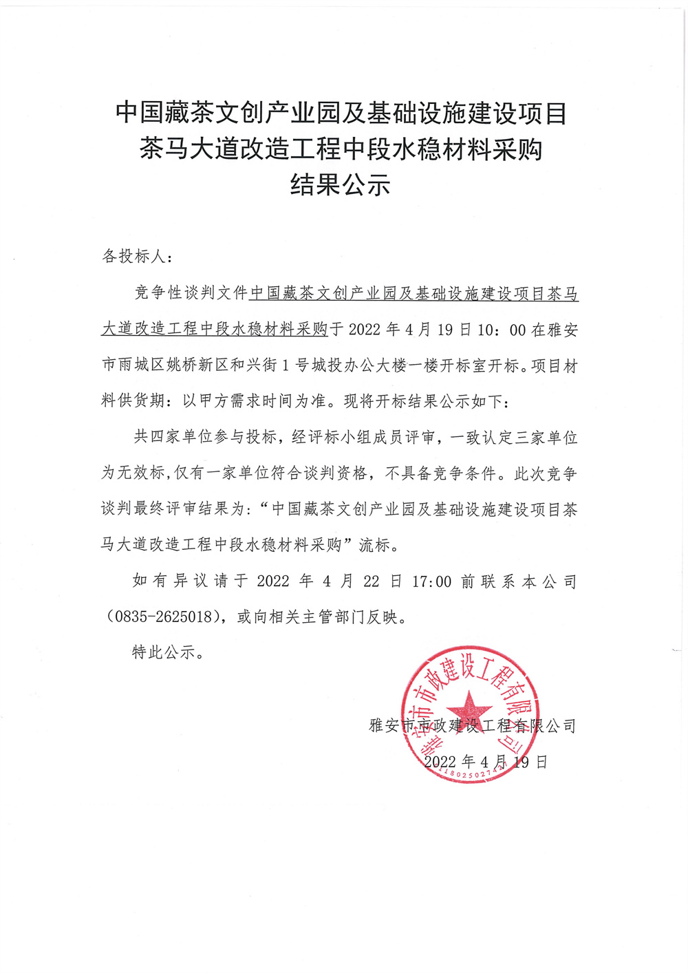 市政公司中國藏茶文創(chuàng)產業(yè)園及基礎設施建設項目茶馬大道改造工程中段水穩(wěn)材料采購結果公示