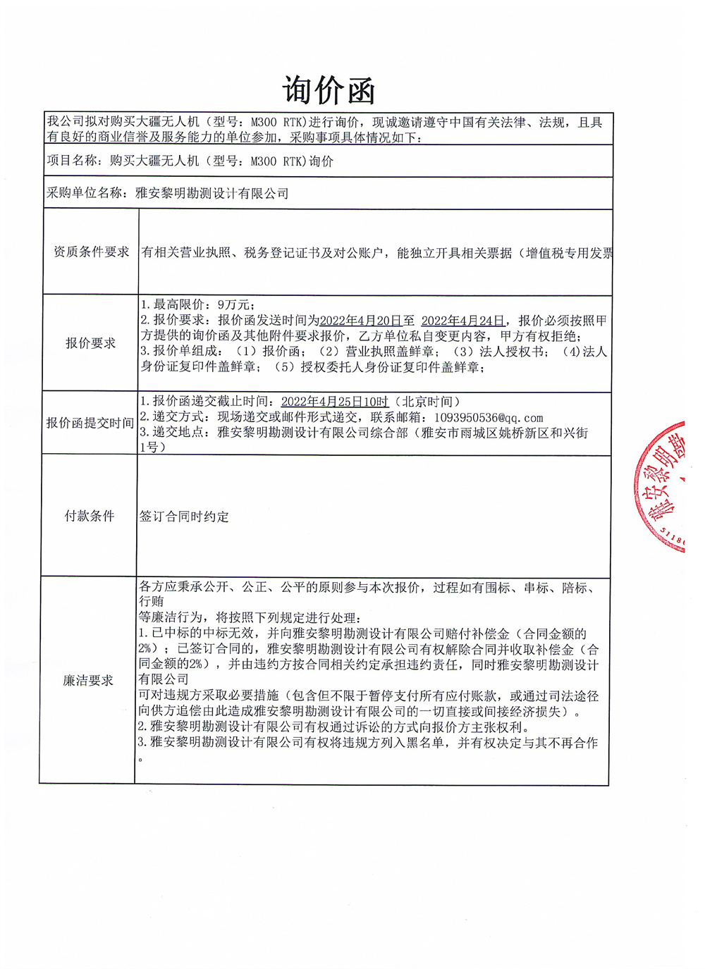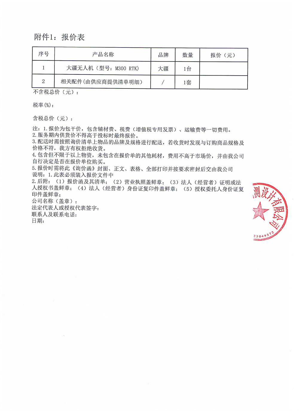 黎明勘測(cè)公司購(gòu)買(mǎi)大疆無(wú)人機(jī)(型號(hào):M300 RTK)詢價(jià)函