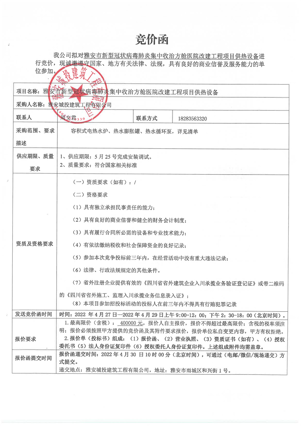 雅安市新型冠狀病毒肺炎集中收治方艙醫(yī)院改建工程項(xiàng)目供熱設(shè)備競價(jià)函