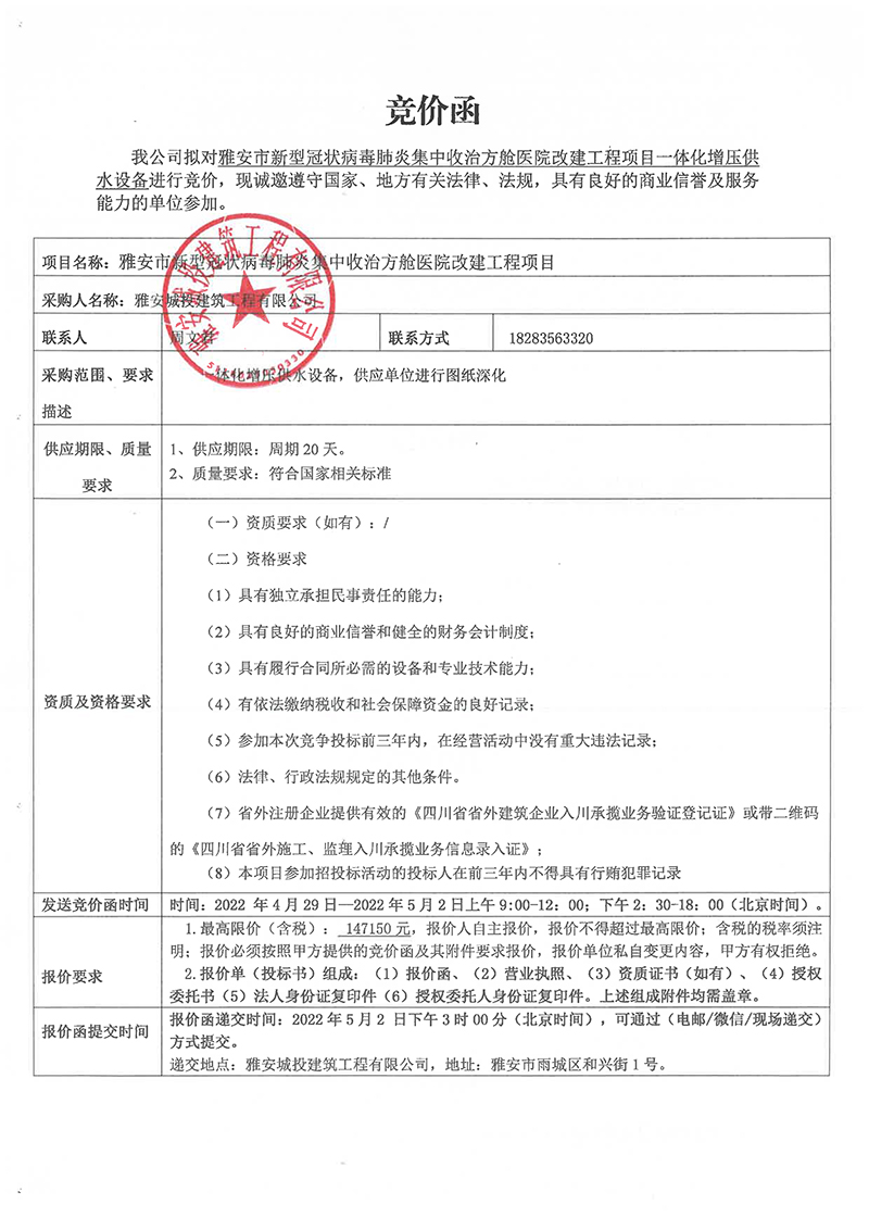 雅安市新型冠狀病毒肺炎集中收治方艙醫(yī)院改建工程項(xiàng)目一體化增壓供水設(shè)備競(jìng)價(jià)函