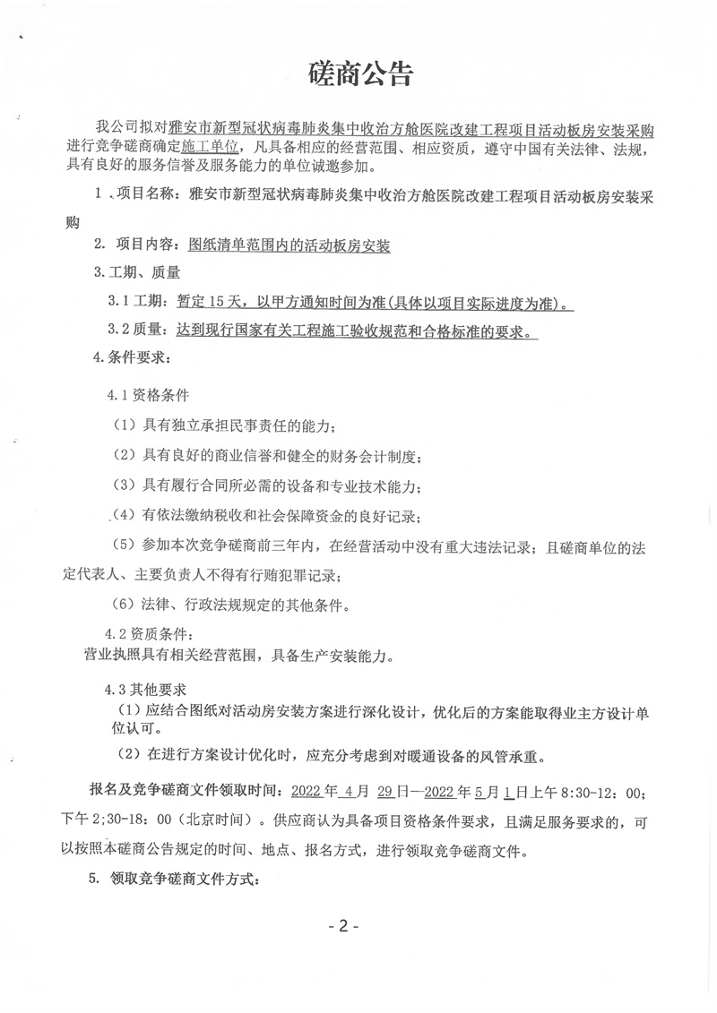 雅安市新型冠狀病毒肺炎集中收治方艙醫(yī)院改建工程項目活動板房采購磋商公告