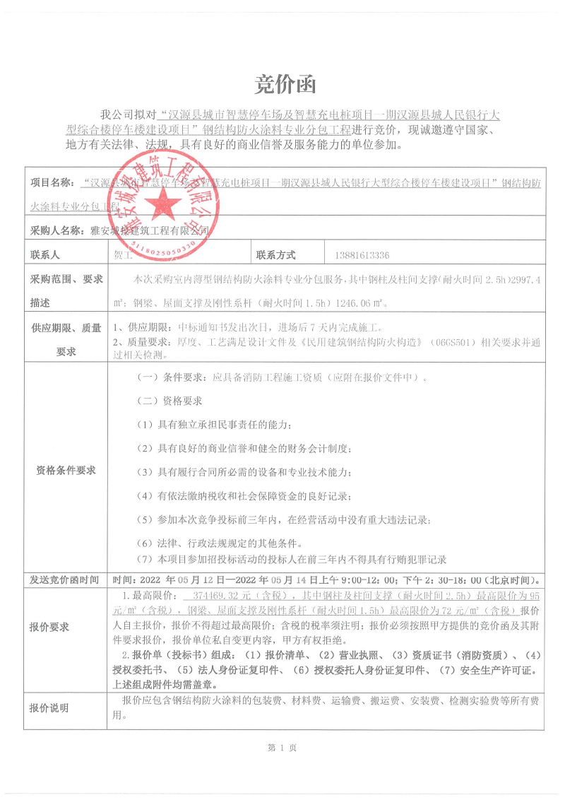 漢源縣城市智慧停車場(chǎng)及智慧充電樁項(xiàng)目一期漢源縣城人民銀行大型綜合樓停車樓建設(shè)項(xiàng)目防火涂料專業(yè)分包競(jìng)價(jià)采購(gòu)公告