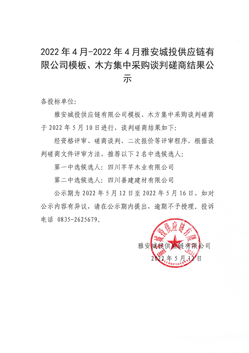 2022年4月-2023年4月雅安城投供應(yīng)鏈有限公司模板、木方集中采購談判磋商結(jié)果公示