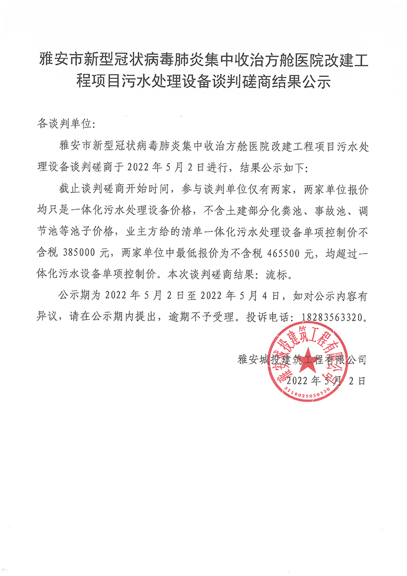 雅安市新型冠狀病毒肺炎集中收治方艙醫(yī)院改建工程項(xiàng)目污水處理設(shè)備談判磋商結(jié)果公示