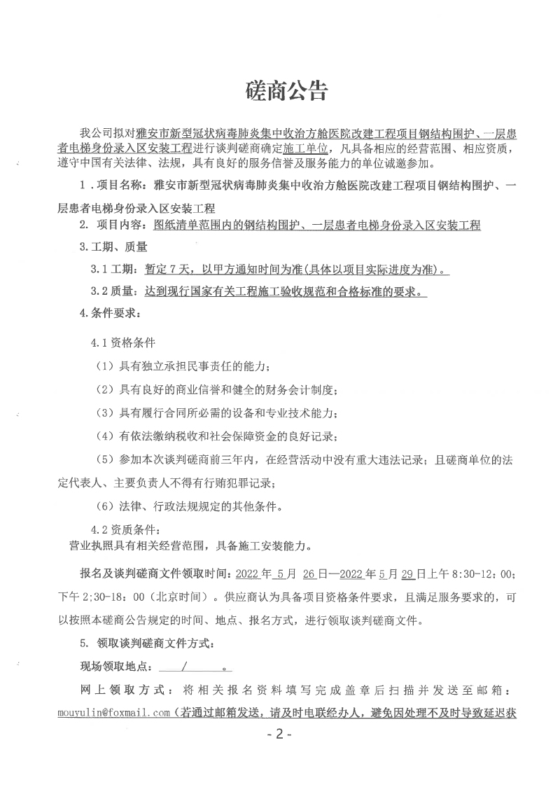 雅安市新型冠狀病毒肺炎集中收治方艙醫(yī)院改建工程項(xiàng)目鋼結(jié)構(gòu)圍護(hù)、一層患者電梯身份錄入?yún)^(qū)安裝工程采購