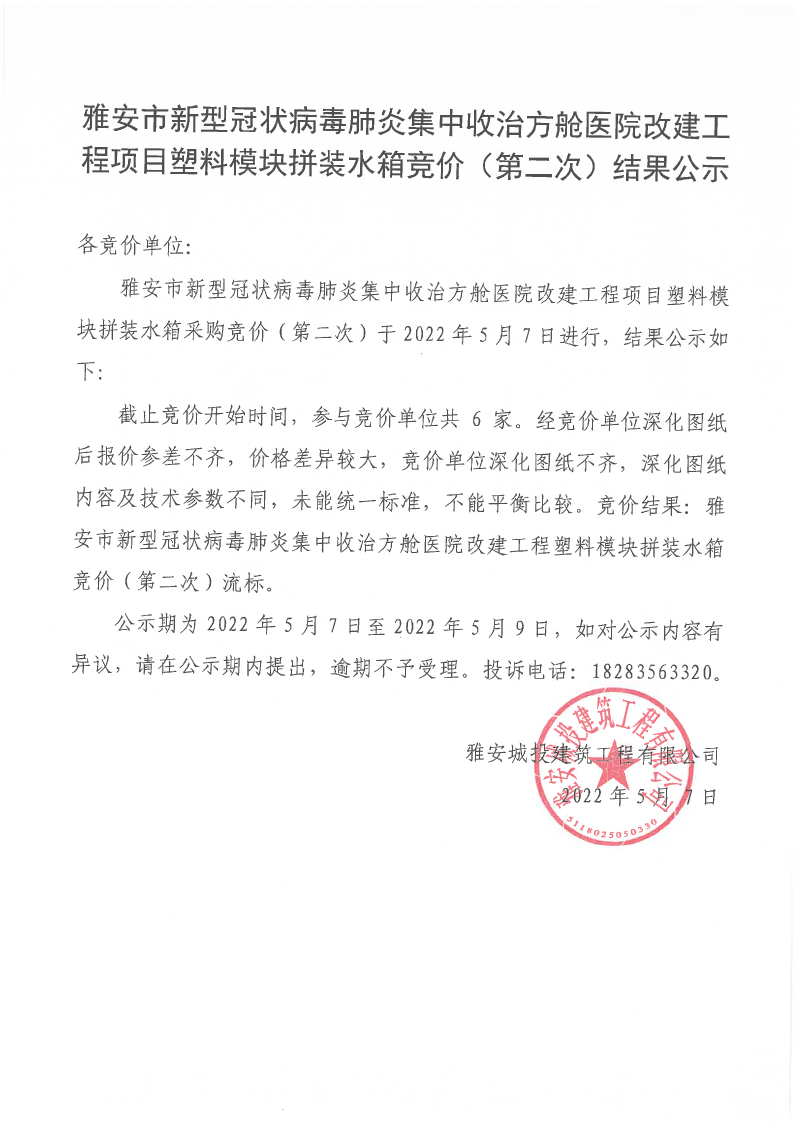 雅安市新型冠狀病毒肺炎集中收治方艙醫(yī)院改建工程項(xiàng)目塑料模塊拼裝水箱競價(jià)(第二次)結(jié)果公示