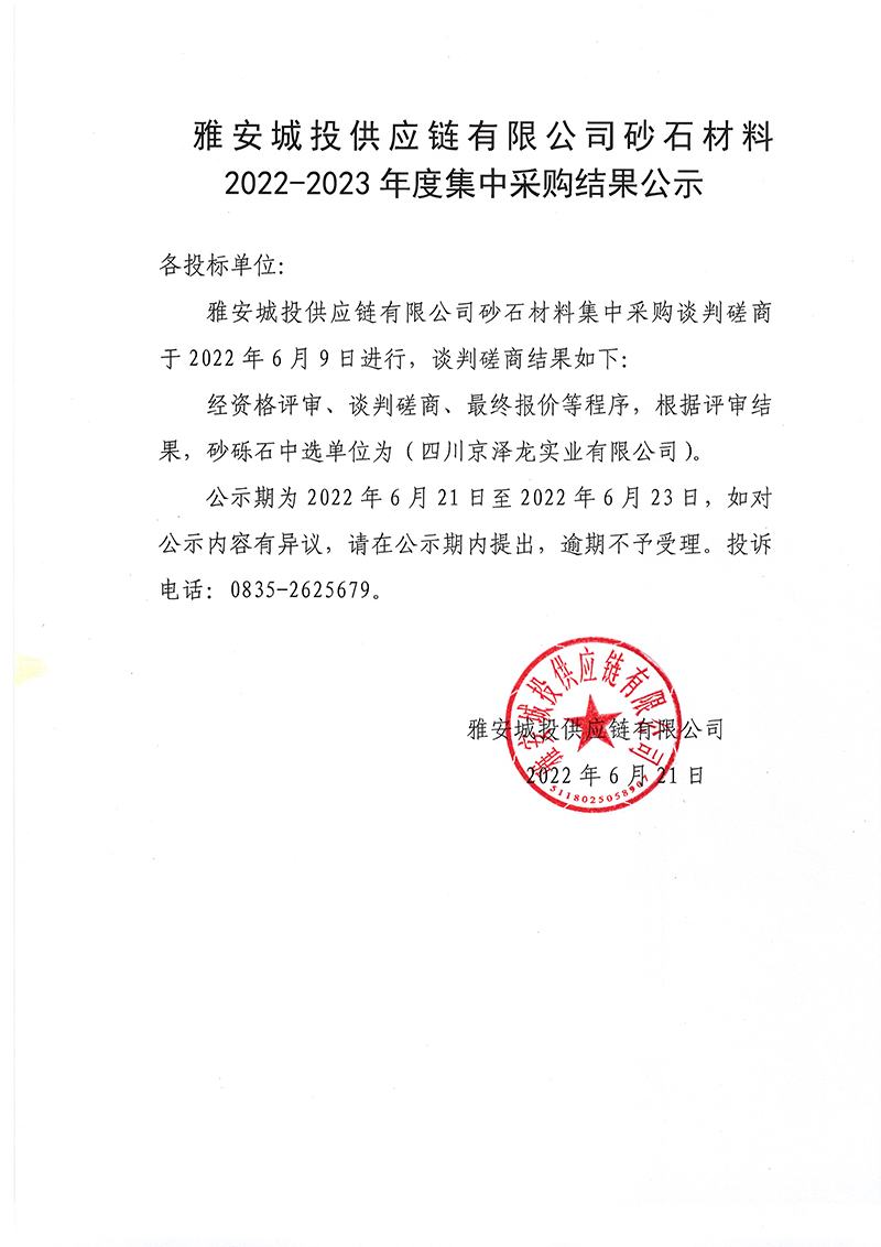 雅安城投供應(yīng)鏈有限公司砂石材料2022-2023年度集中采購結(jié)果公示