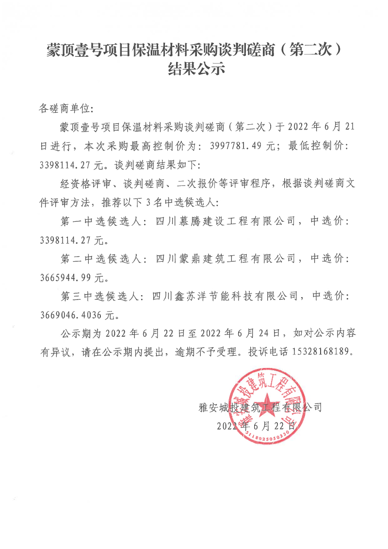 蒙頂壹號項目保溫材料采購談判磋商(第二次)結(jié)果公示