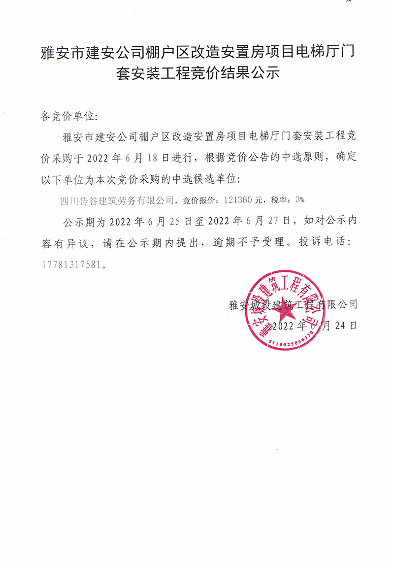 雅安市建安公司棚戶區(qū)改造安置房項(xiàng)目項(xiàng)目電梯廳門套安裝工程競(jìng)價(jià)結(jié)果公示