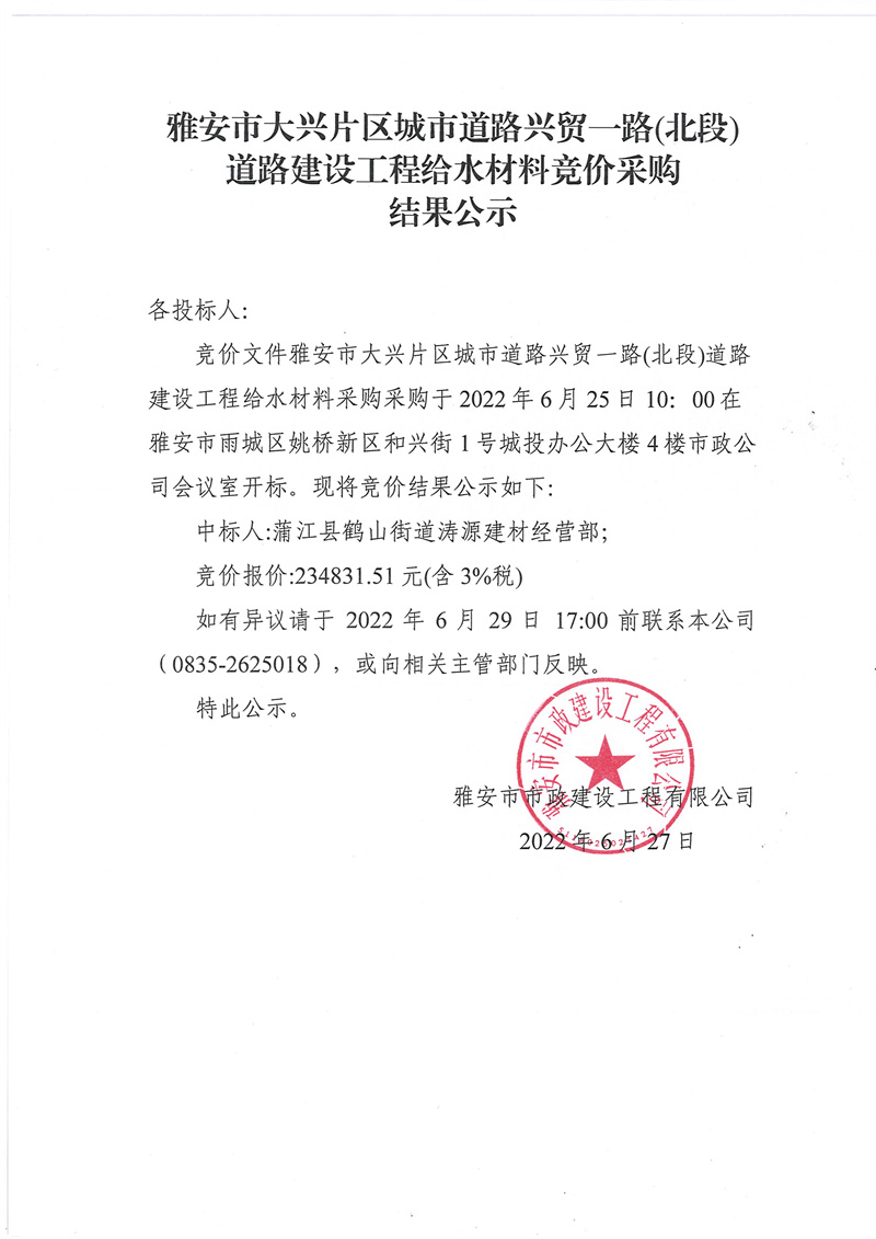 雅安市大興片區(qū)城市道路興貿(mào)一路(北段) 道路建設(shè)工程給水材料采購結(jié)果公告