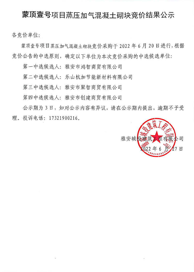 蒙頂壹號(hào)項(xiàng)目蒸壓加氣混凝土砌塊采購(gòu)內(nèi)容競(jìng)價(jià)結(jié)果公示