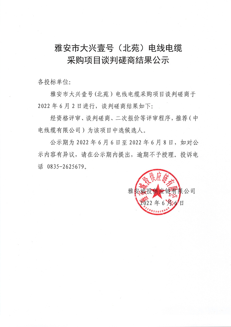 雅安城投供應(yīng)鏈有限公司大興壹號(hào)(北苑)項(xiàng)目電線電纜談判磋商結(jié)果公示