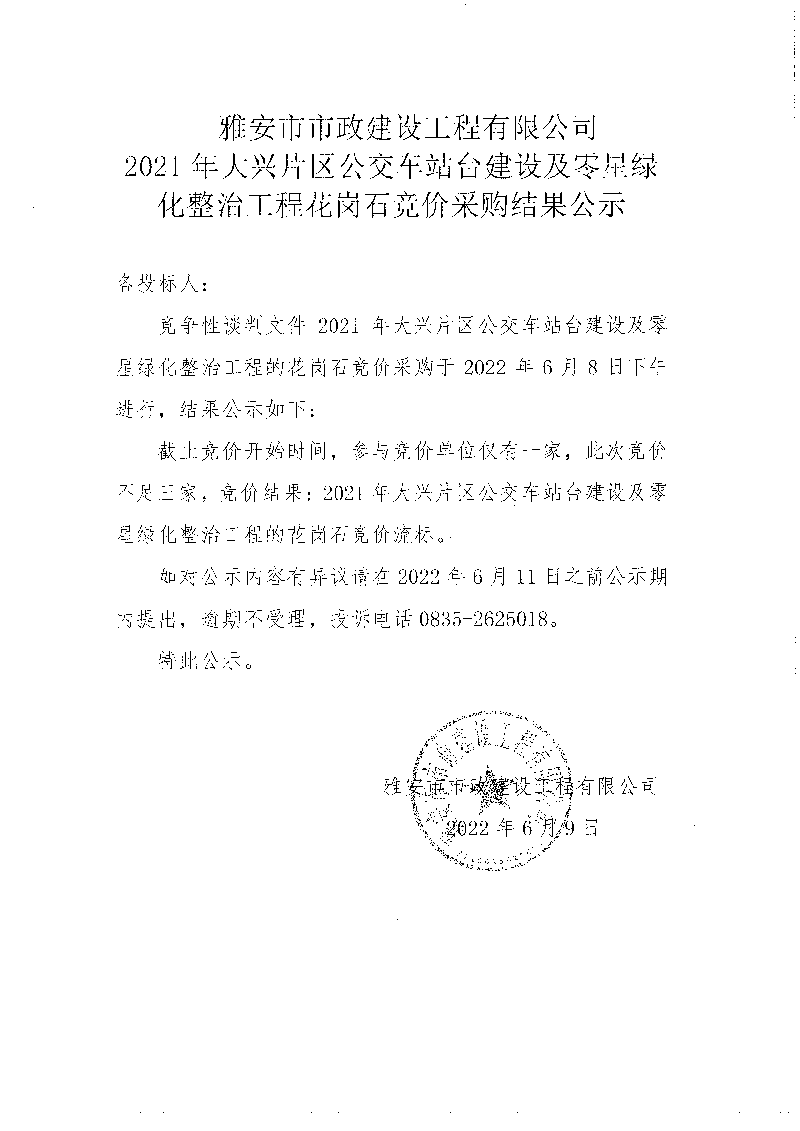2021年大興片區(qū)公交站臺(tái)建設(shè)及零星綠地整治工程花崗石競(jìng)價(jià)采購(gòu)結(jié)果公示