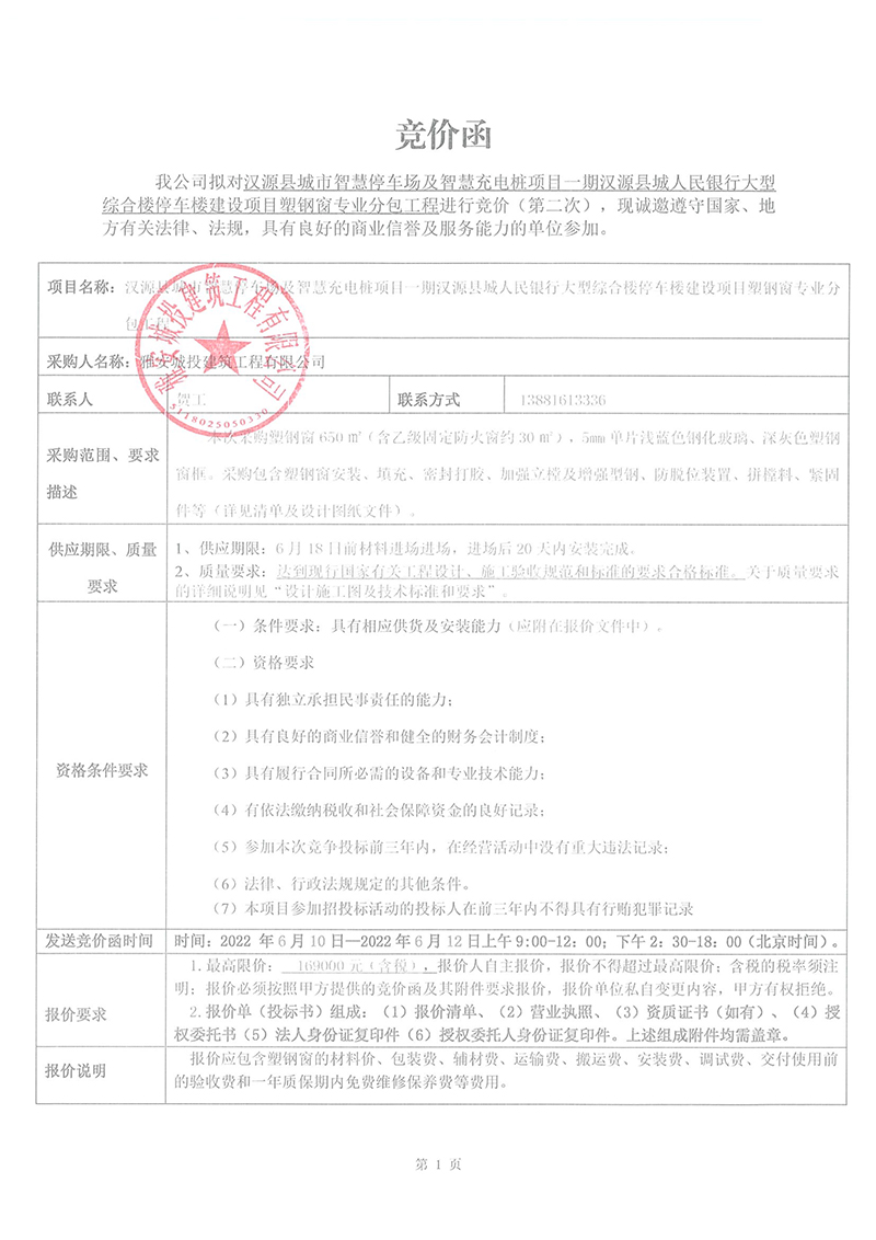 漢源縣城市智慧停車場及智慧充電樁項目一期漢源縣城人民銀行大型綜合樓停車樓建設(shè)項目塑鋼窗專業(yè)分包工程競價采購競價公告