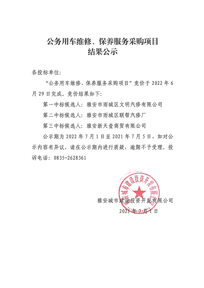 雅安城市建設投資開發(fā)有限公司 公務用車維修、保養(yǎng)服務采購項目結(jié)果公示
