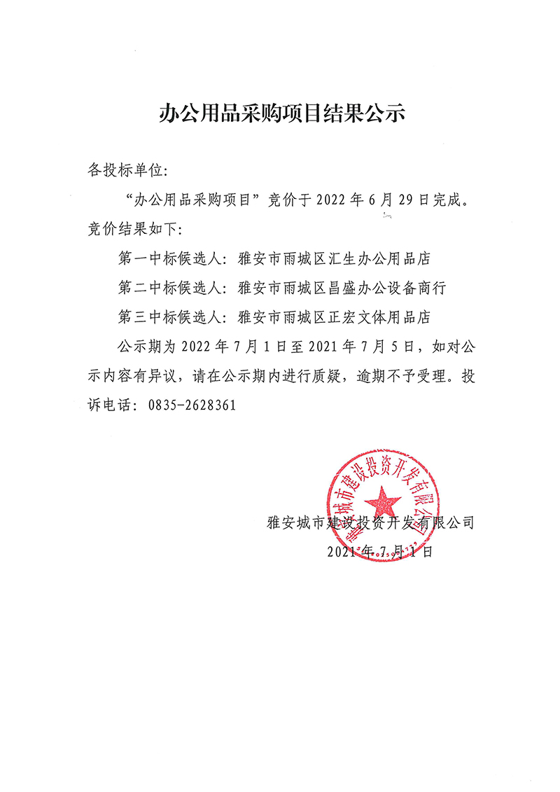 雅安城市建設(shè)投資開(kāi)發(fā)有限公司辦公用品采購(gòu)項(xiàng)目競(jìng)價(jià)結(jié)果公示