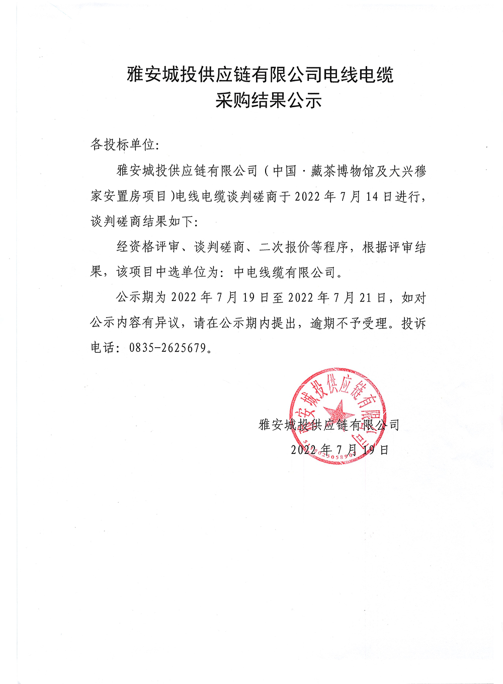 雅安城投供應(yīng)鏈有限公司電線電纜采購(gòu)結(jié)果公示