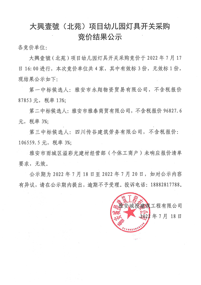 大興壹號(hào)(北苑)項(xiàng)目幼兒園燈具開(kāi)關(guān)競(jìng)價(jià)結(jié)果公示
