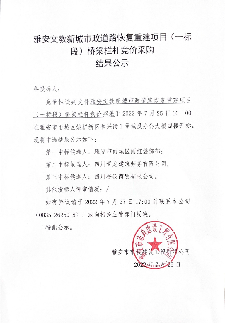 雅安文教新城市政道路恢復(fù) 重建項(xiàng)目競價(jià)(一標(biāo)段)橋梁欄桿競價(jià)采購結(jié)果公示