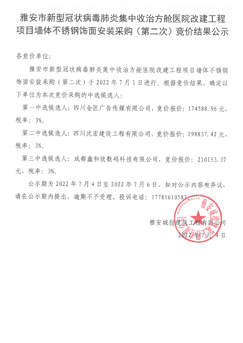 雅安市新型冠狀病毒肺炎集中收治方艙醫(yī)院改建工程項目墻體不銹鋼飾面安裝采購(第二次)競價結果公示