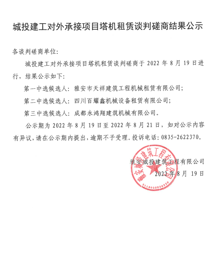 城投建工對外承接項目塔機租賃談判磋商結果公示