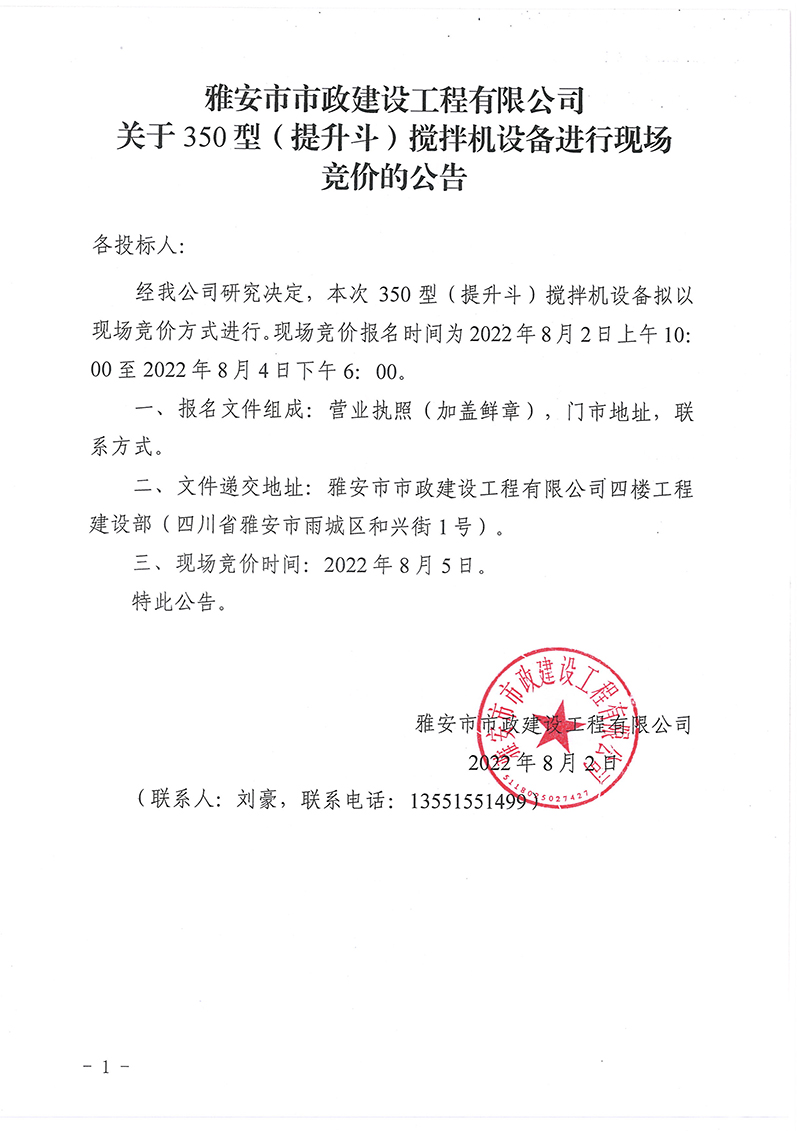 關(guān)于350型(提升斗)攪拌機設(shè)備進行現(xiàn)場競價的公告