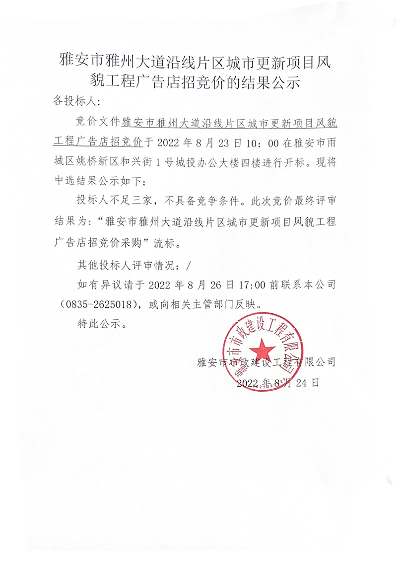 雅安市雅州大道沿線片區(qū)城市更新項(xiàng)目風(fēng)貌工程廣告店招競(jìng)價(jià)的結(jié)果公示