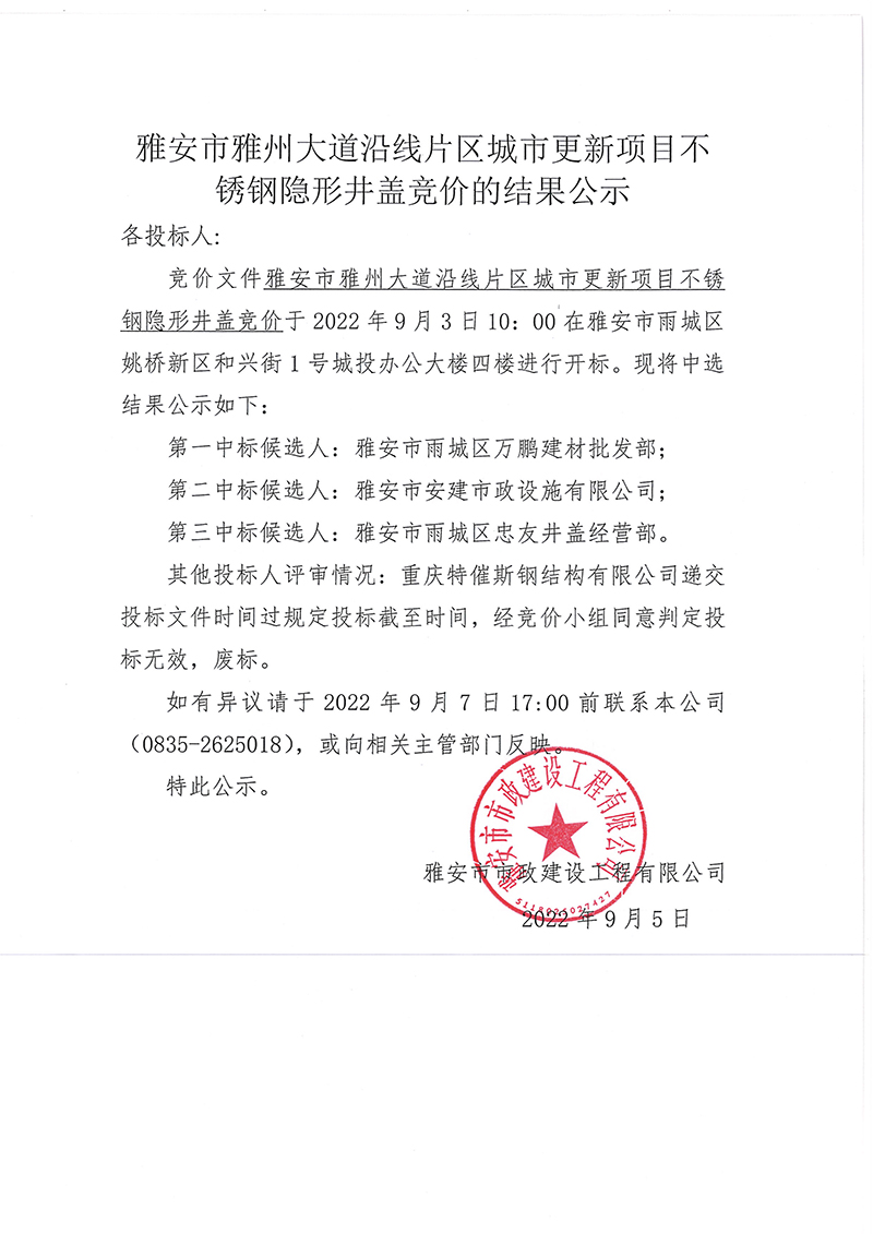 雅安市雅州大道沿線片區(qū)城市更新項目不銹鋼隱形井蓋競價招采競價的結(jié)果公示