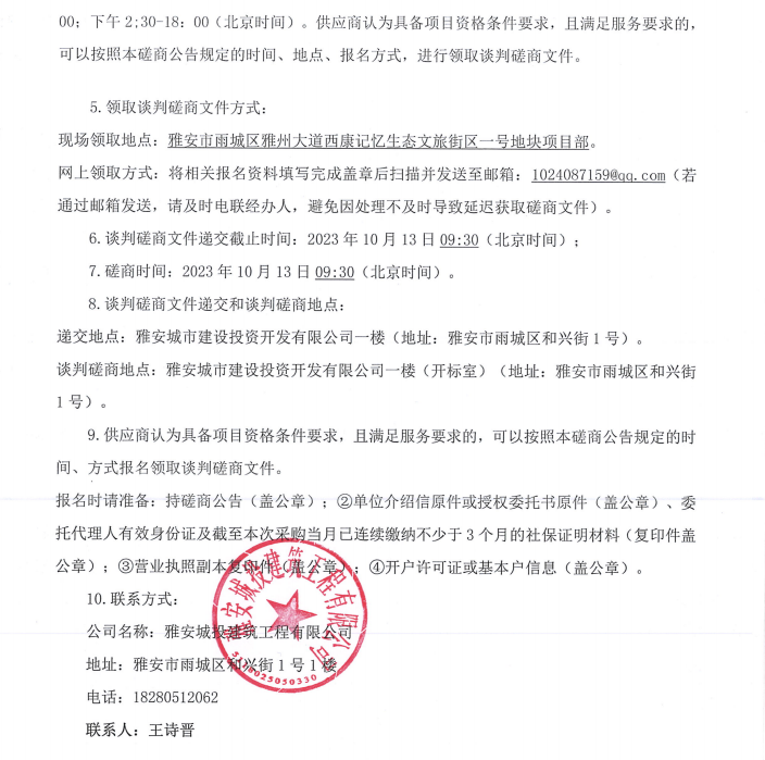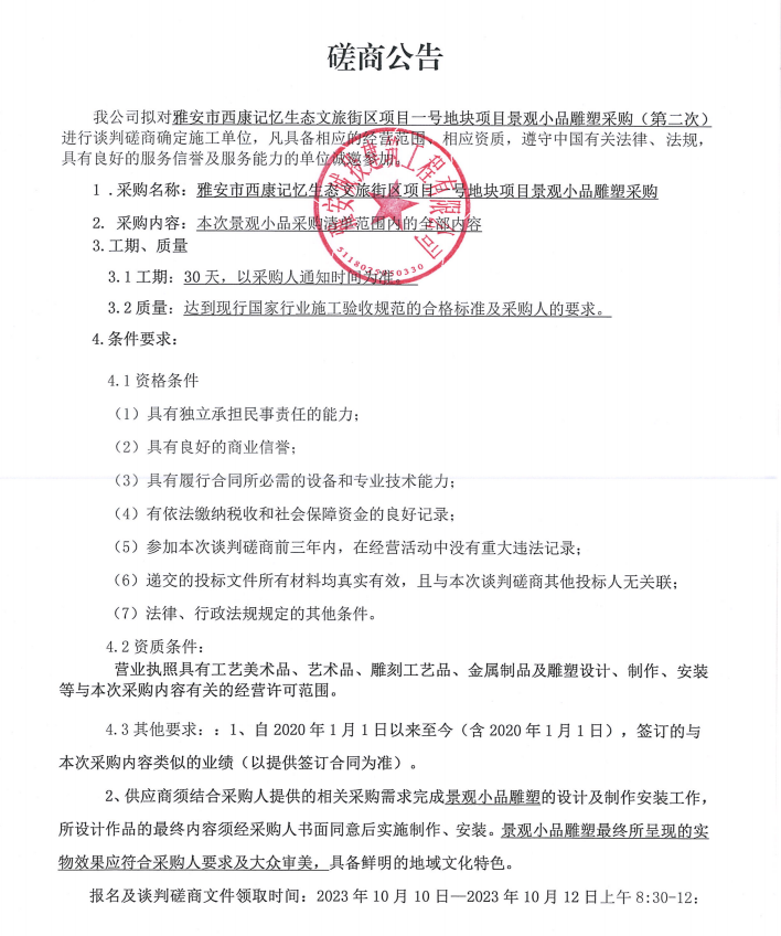 雅安市西康記憶生態(tài)文旅街區(qū)項(xiàng)目一號地塊項(xiàng)目景觀小品雕塑采購(第二次)談判磋商公告