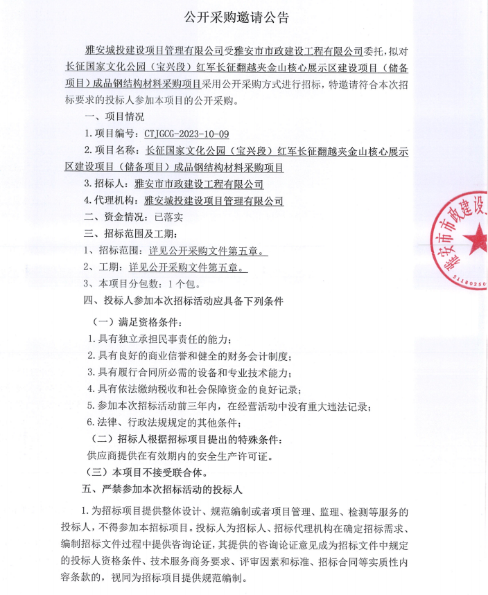 長征國家文化公園(寶興段)紅軍長征翻越夾金山核心展示區(qū)建設項目(儲備項目)成品鋼結構材料采購項目公開采購邀請公告