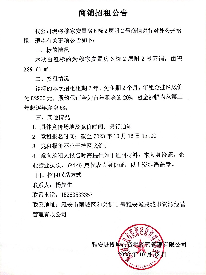 穆家安置房6棟2層附2號商鋪招租公告