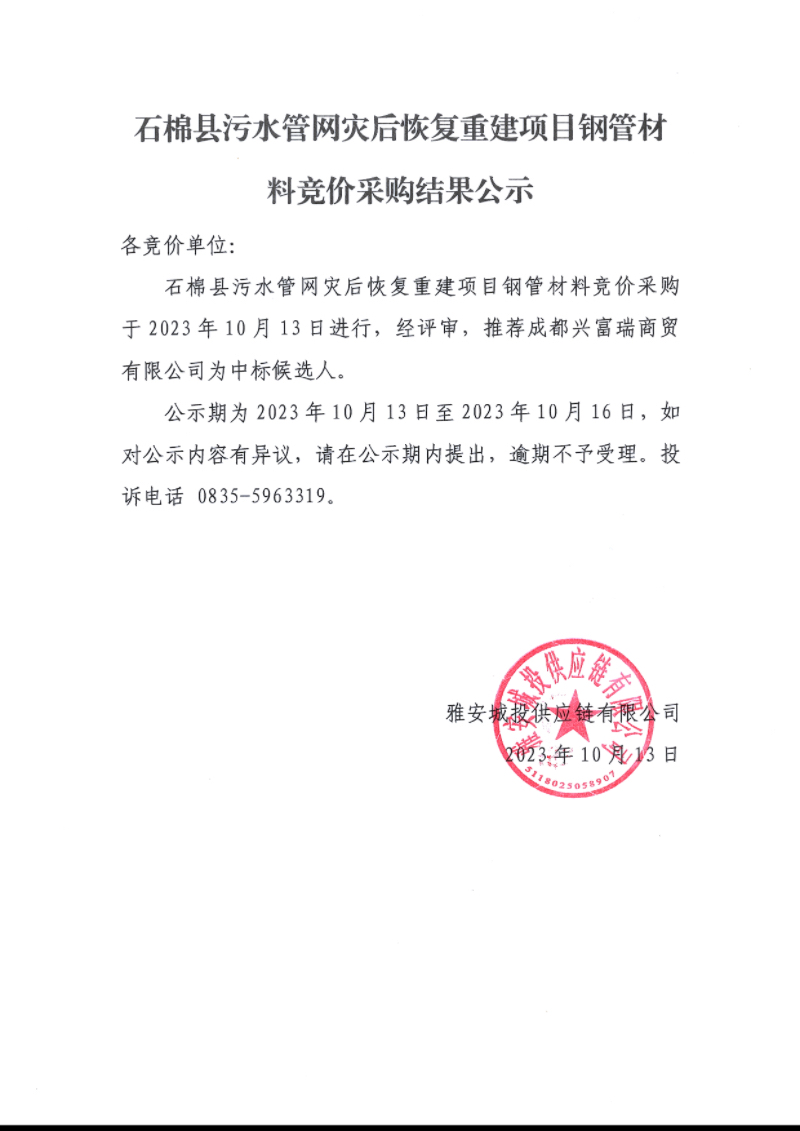 石棉縣污水管網(wǎng)災(zāi)后恢復(fù)重建項(xiàng)目鋼管材料競價采購結(jié)果公示
