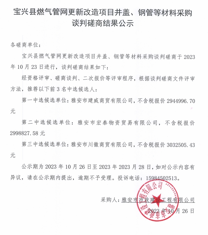 寶興縣燃?xì)夤芫W(wǎng)更新改造項(xiàng)目井蓋、鋼管等材料采購(gòu)談判磋商結(jié)果公示