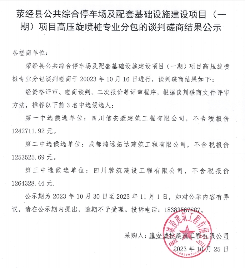 滎經縣公共綜合停車場及配套基礎設施建設項目(一期)項目高壓旋噴樁專業(yè)分包的談判磋商結果公示