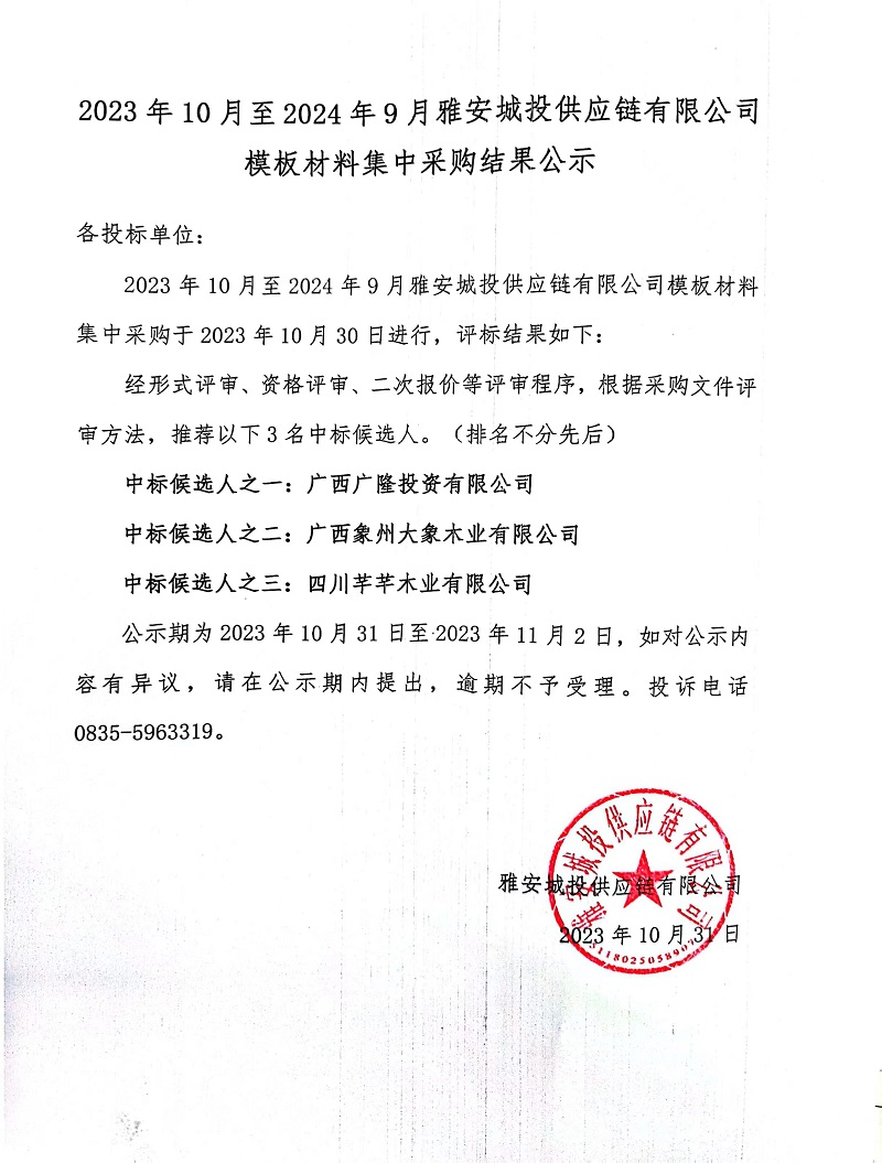 203年10月至2024年9月雅安城投供應(yīng)鏈有限公司模板材料集中采購結(jié)果公示