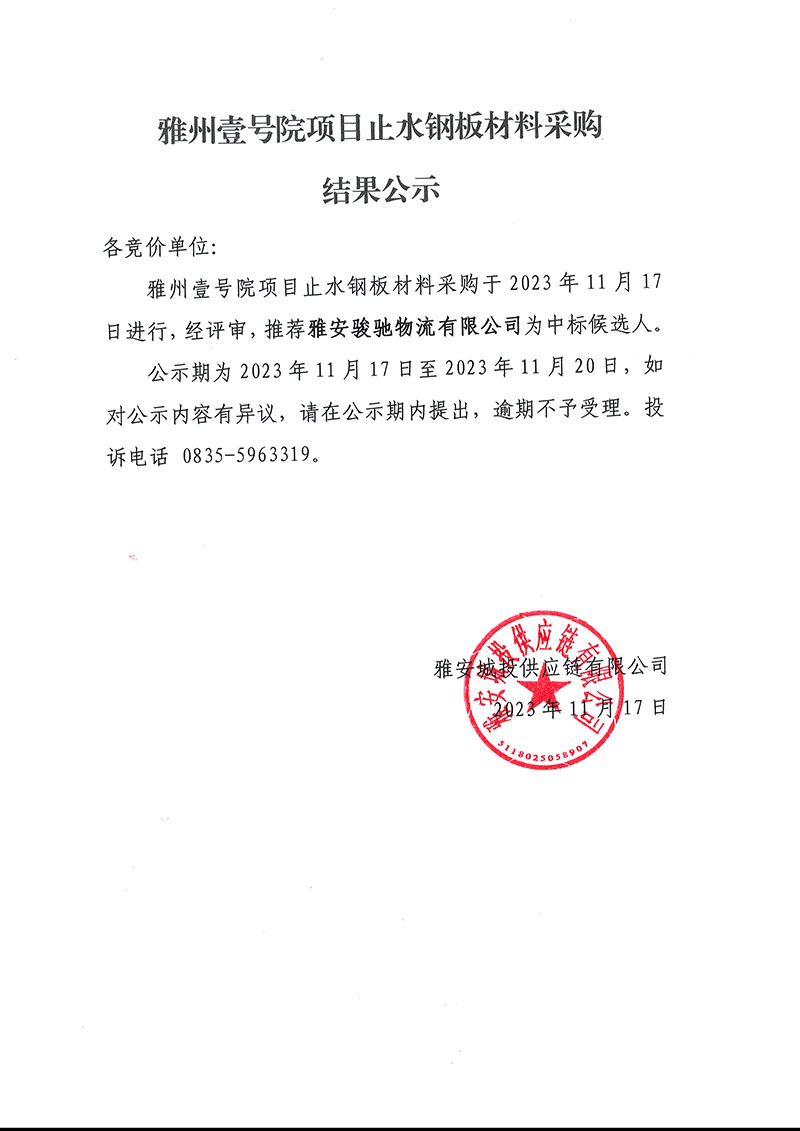 雅州壹號(hào)院項(xiàng)目止水鋼板材料采購結(jié)果公示