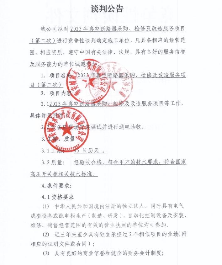 2023年真空斷路器采購、檢修及改造服務(wù)項(xiàng)目(第二次)談判公告