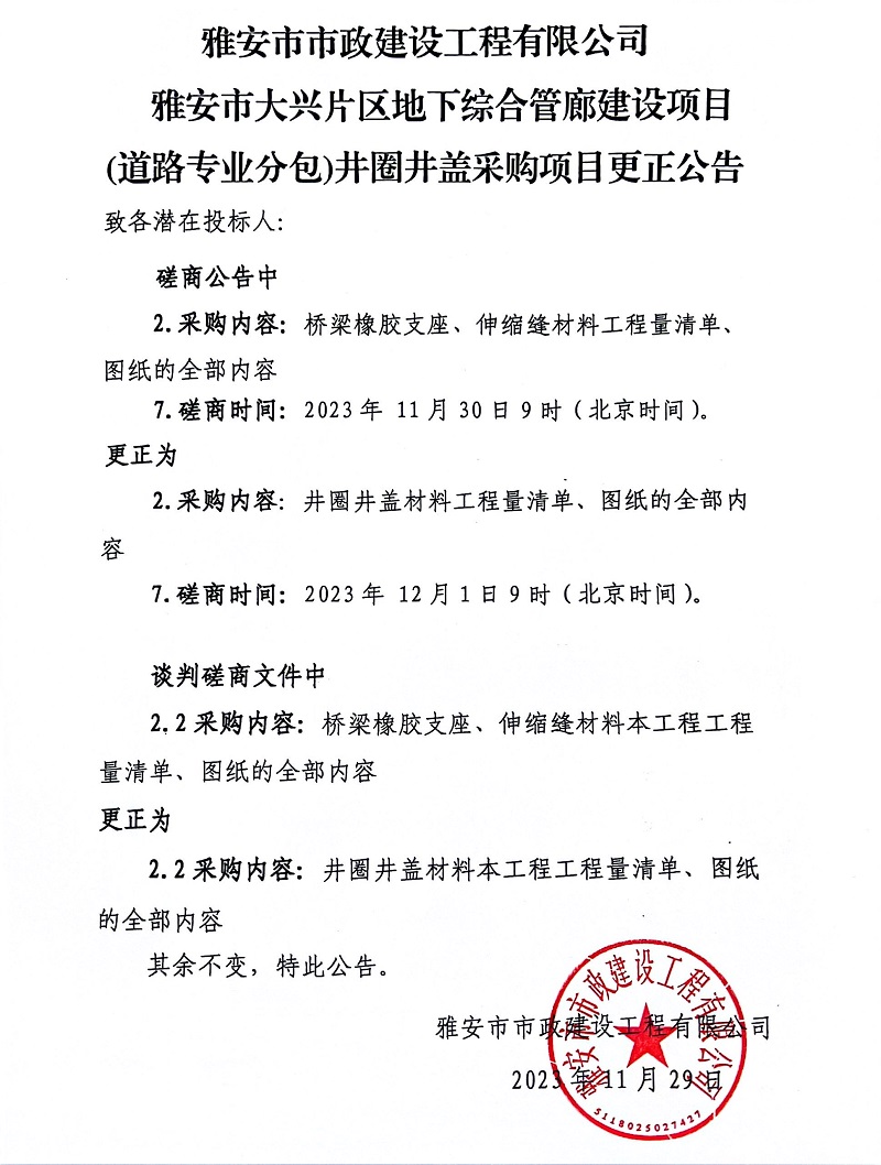 雅安市市政建設(shè)工程有限公司雅安市大興片區(qū)地下綜合管廊建設(shè)項目(道路專業(yè)分包)井圈井蓋采購項目更正公告