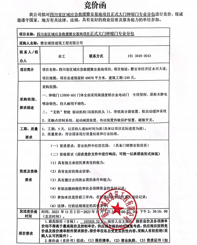 四川省區(qū)域應(yīng)急救援雅安基地項(xiàng)目正式大門伸縮門專業(yè)分包競(jìng)價(jià)公告