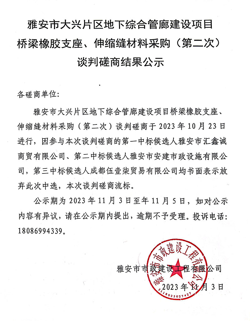 雅安市大興片區(qū)地下綜合管廊建設項目橋梁橡膠支座、伸縮縫材料采購(第二次)談判磋商結果公示
