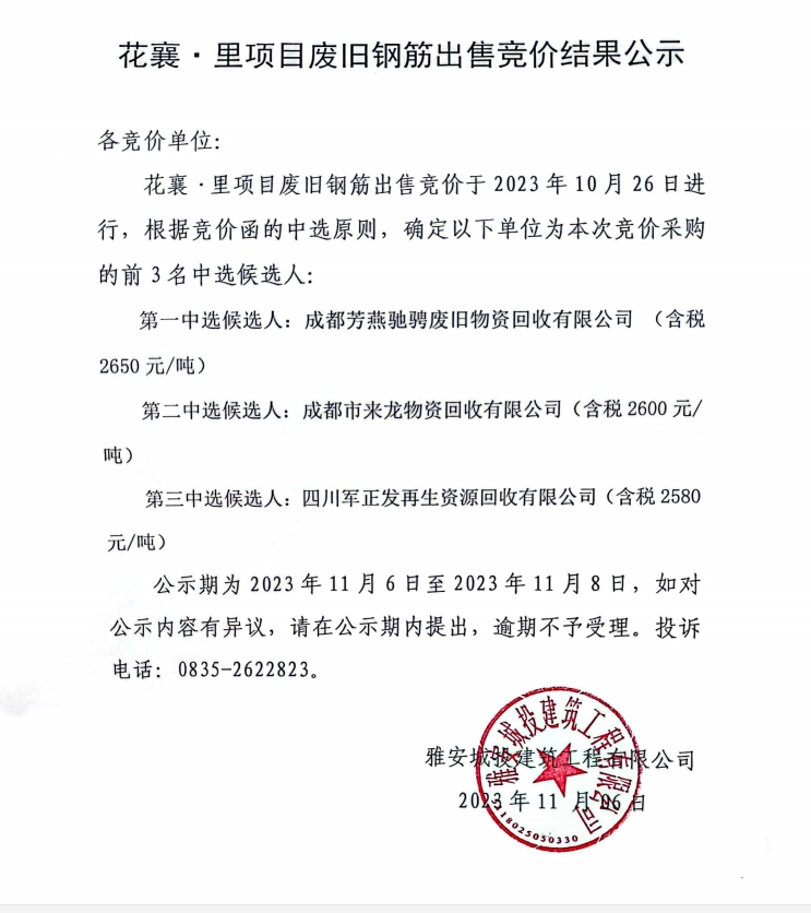 花襄·里廢舊鋼筋出售競價結(jié)果公示