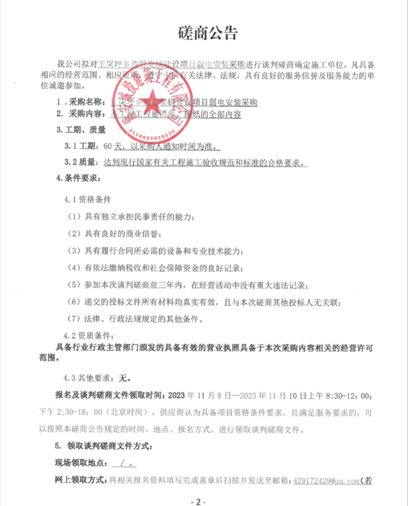 王崗坪鄉(xiāng)旅游集鎮(zhèn)建設(shè)項目弱電安裝采購談判磋商公告