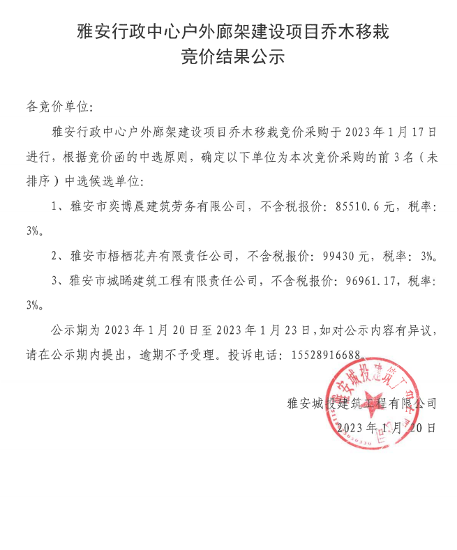 雅安行政中心戶外廊架建設(shè)項(xiàng)目喬木移栽競價(jià)結(jié)果公示