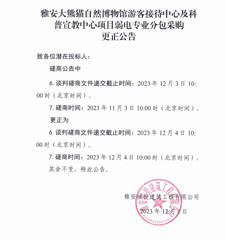 雅安大熊貓自然博物館接待中心及科普宣教中心項(xiàng)目弱電專業(yè)分包采購(gòu)更正公告