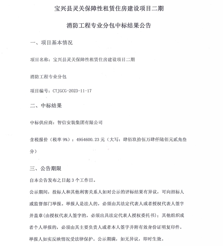 寶興縣靈關(guān)保障性租賃住房建設(shè)項(xiàng)目二期消防工程專業(yè)分包中標(biāo)結(jié)果公告