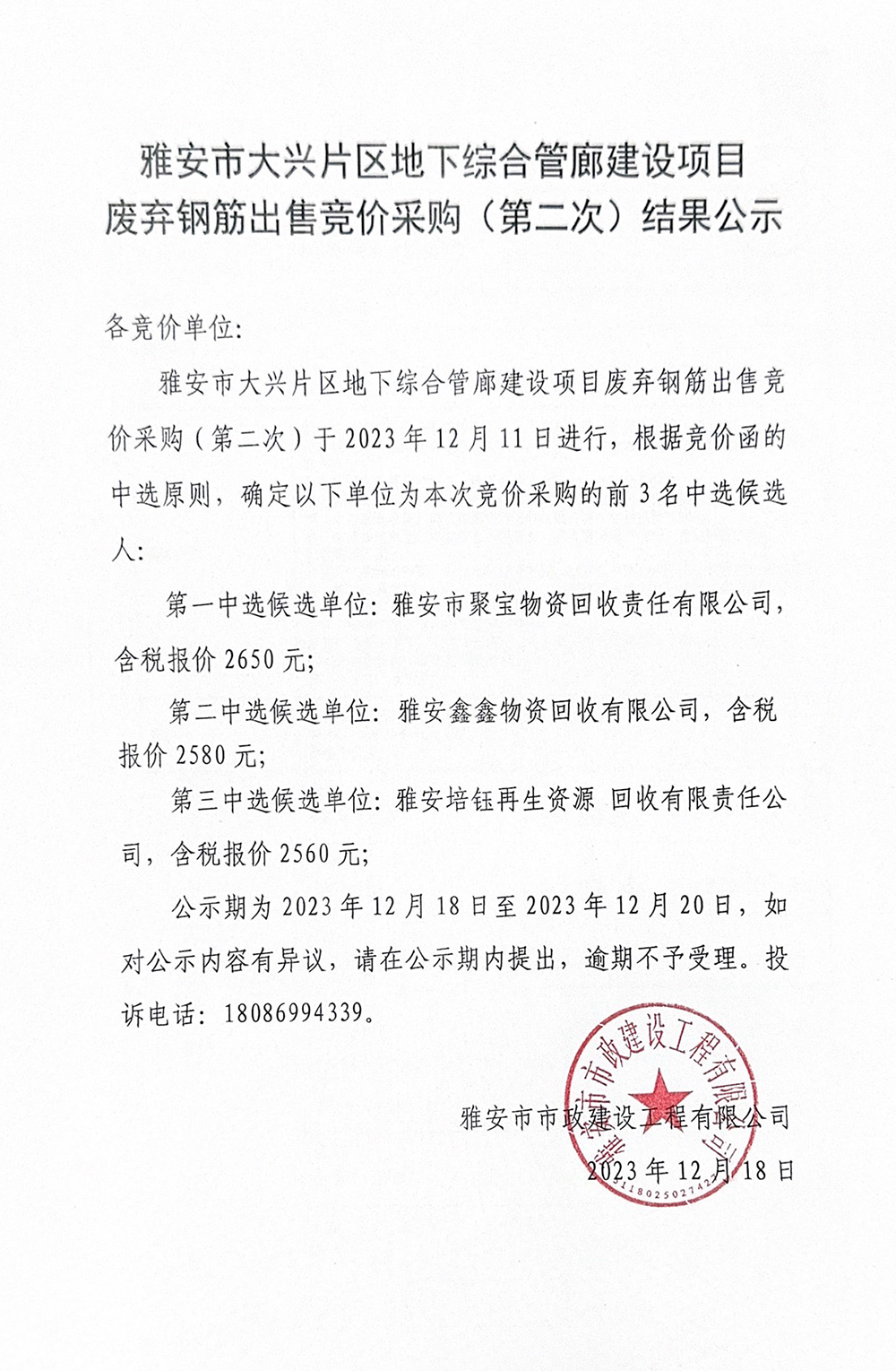 雅安市大興片區(qū)地下綜合管廊建設(shè)項目廢棄鋼筋出售競價采購(第二次)結(jié)果公示