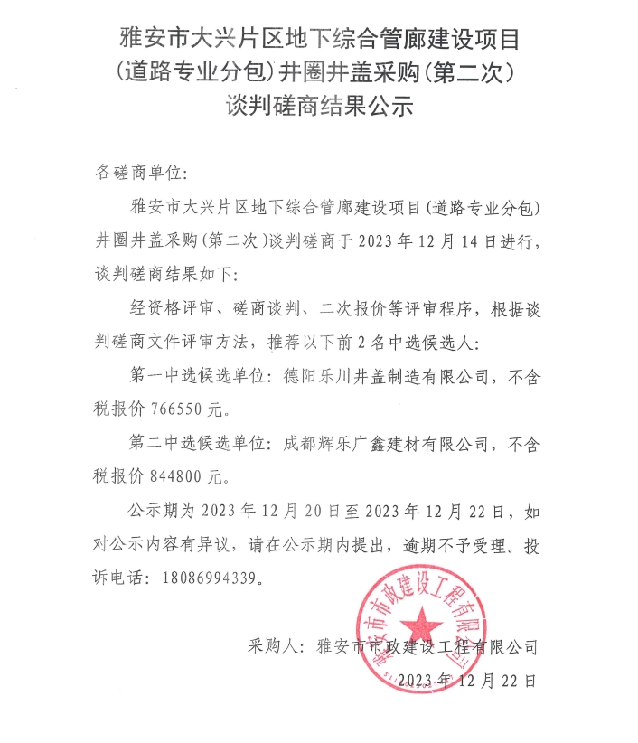 雅安市大興片區(qū)地下綜合管廊建設(shè)項(xiàng)目(道路專業(yè)分包)井圈井蓋采購(第二次)談判磋商結(jié)果公示